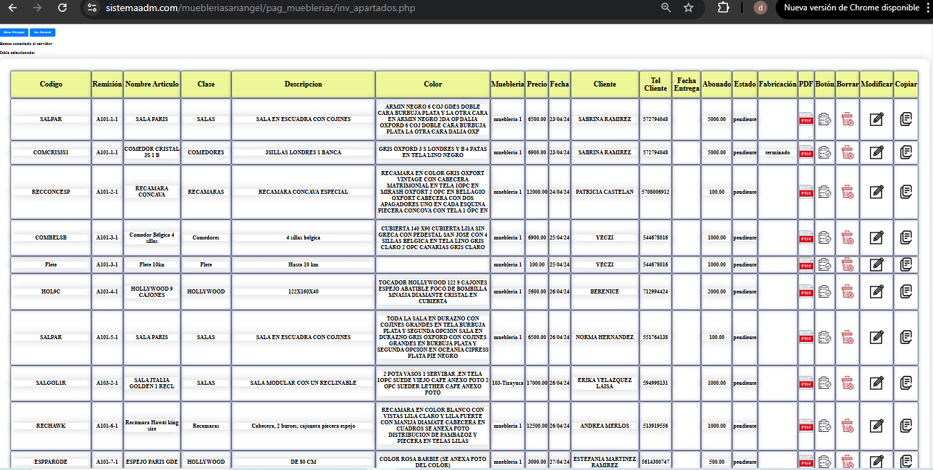 Creación y programación de un sistema administrativo que gestiona la entrada, salida y ventas de artículos dentro del taller de fabricación y de 6 mueblerías. Sistema de usuarios con diferentes jerarquías (Administrador, Empleado de acuerdo a la sucursal y cliente) a través de cualquier navegador web(Chrome, edge, etc..) todo alimentado por datos de una Base de datos con entrada y salida de informacion hecha en MySql almacenada en un servidor de hostinguer hecho y administrado por mi